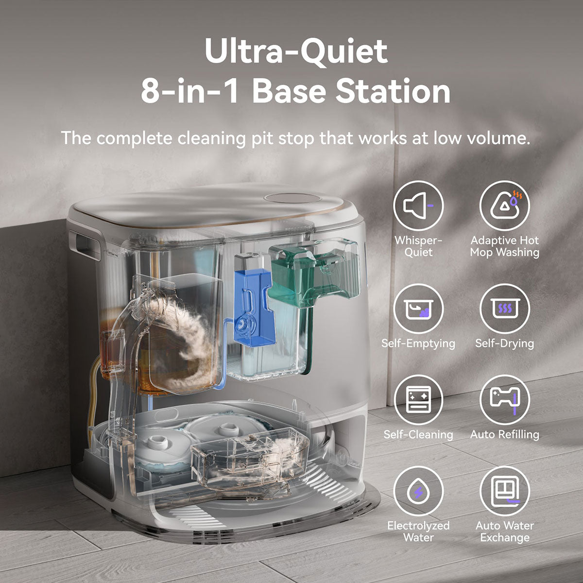 Narwal Freo Z Ultra Vacuum And Mop Robot Cleaner features leading 12000Pa Suction and an all in one base. It auto washes, dries and cleans. Revolutionary Self Empty 2.0. 7 weeks dust storage with self contained dust compress. TwinAI Dodge Obstacle Avoidance for Precise avoidance and edge cleaning of complex obstacles.