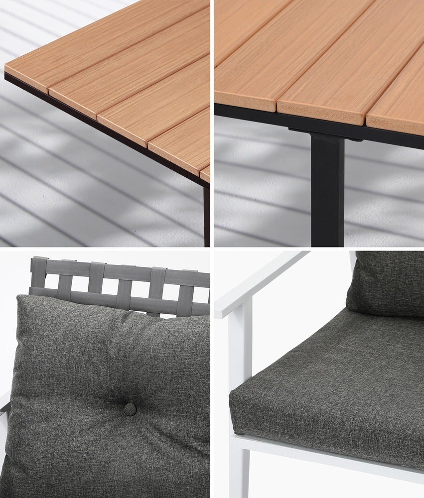 Living life to the fullest. Chilling out under the sun, moon and stars. Alfresco dining with friends, family or just with your precious me-time. Simply pursuing and enjoying life that's meant to be. And the Outdoor Dining Set is ready to be there at home with you. Stylish. Contemporary. Beautiful. For the dining table, a unique composite wood/plastic top with a natural wood grain finish. And for the dining chairs, equally attractive pieces that go well with the table. The set has all the attributes of chic outdoor furniture that resonate with your discerning lifestyle. Have your lattes, your favourite brews and savour delectable cuisines and other gastronomical delights. Eat, drink and be merry! But how does the dining set stand up to the harsh and sometimes fickle Australian weather? No worries mate as it's all weather-resistant, chairs and table, with strength and durability for robust use. Not least, this dining setup also looks fabulous with any indoor eclectic styling ideas that you may have. Convinced that this delightful outdoor package is for you? Click on the Buy option and soon you'll be feasting to your (and many others too) heart's content at the Outdoor Dining Set day and night, night and day, in every season.