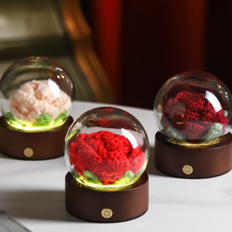 • 1 x Crochet Flower LED Night Light with Glass Dome & Wood Base