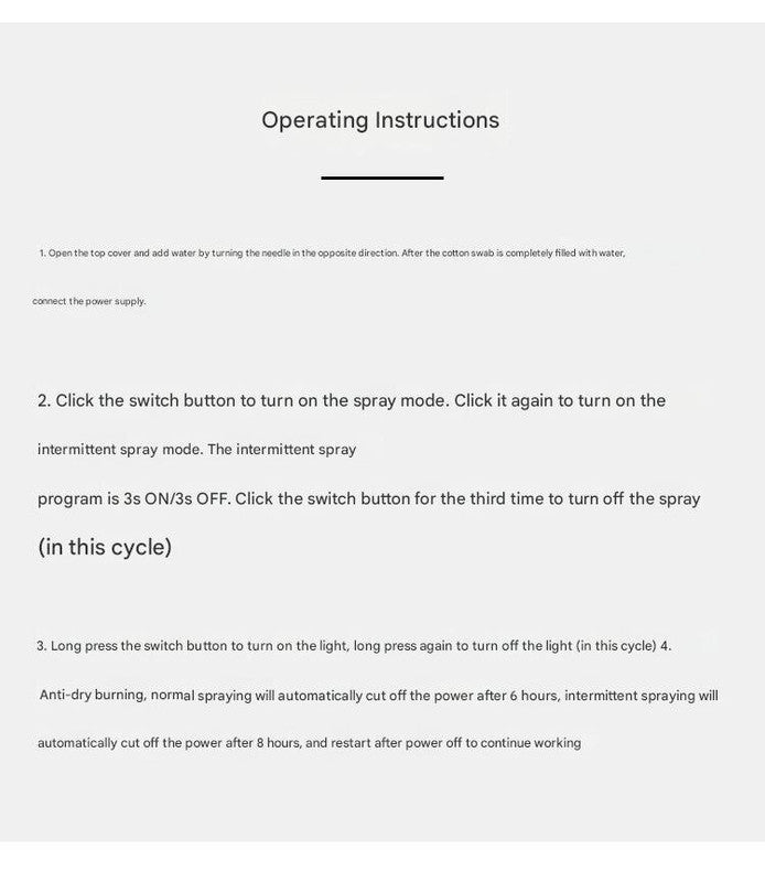 • Two Mist Modes: Choose between continuous spray (approx. 6 hours runtime) or intermittent spray (3 seconds on, 3 seconds off - approx. 8 hours runtime) to suit your needs.