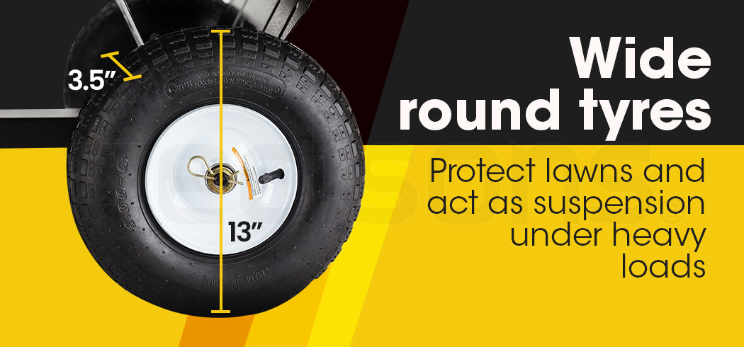 Thesteel chassisis built to handle the knocks of daily use and to stay stiff over bumps, and through ditches. The massive 13" pneumatic tyres are perfect for carting across lawns, through soil, and mud. Their round 3.5" wide treadis designed for manoeuvrability, and are gentle on soft terrains.