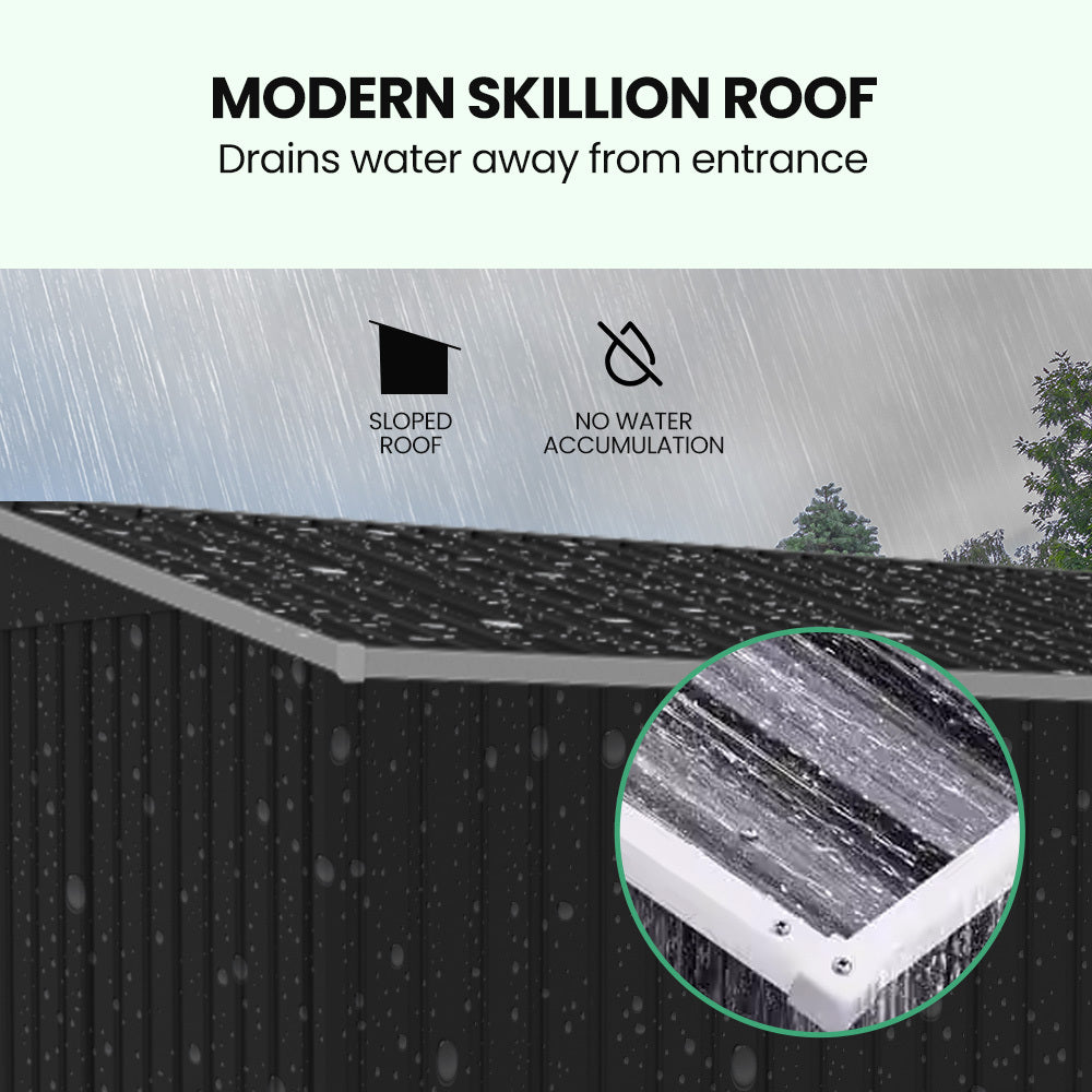 The skillion roof design effectively channels water away, keeping the entrance dry. The sliding doors offer smooth operation and include lockable handles, providing an option to secure your belongings (lock not included).