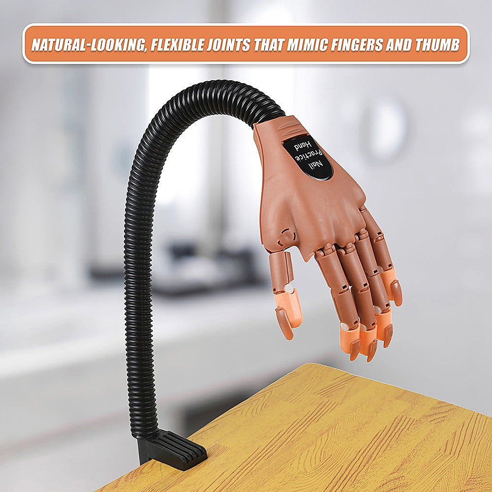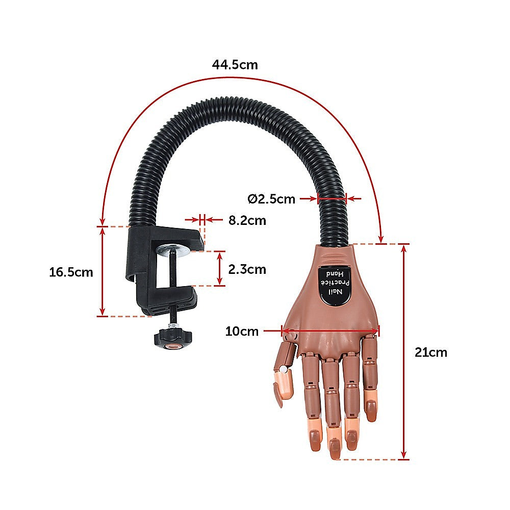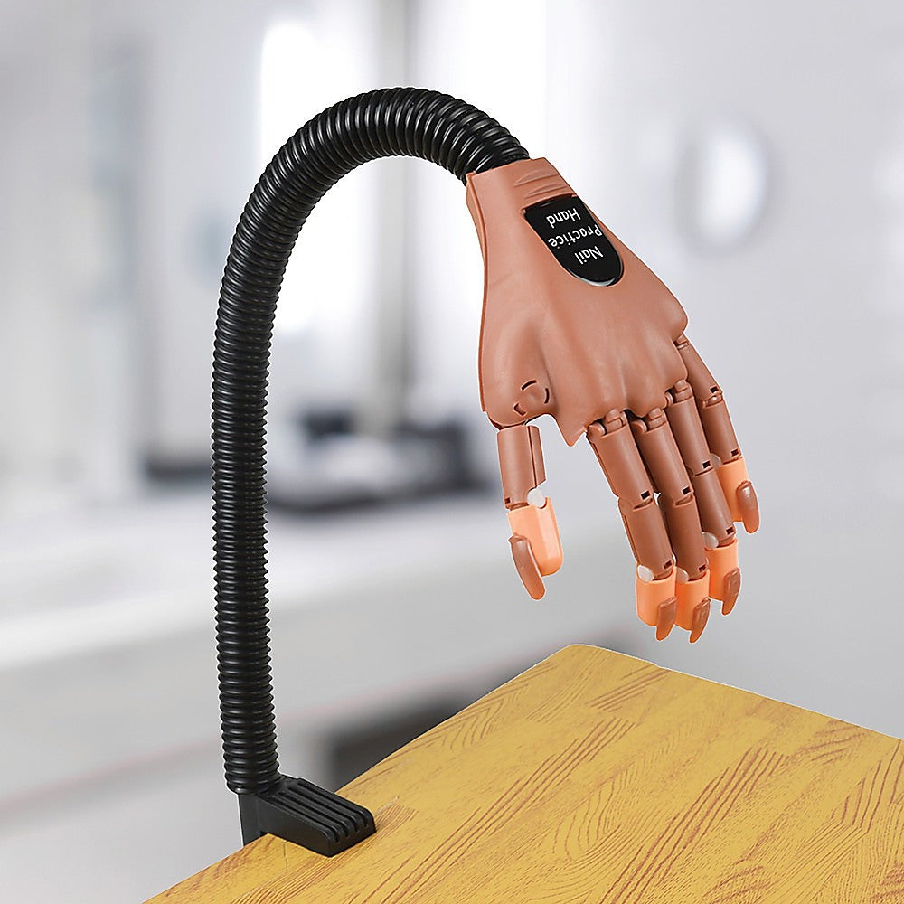 Whether you're a professional manicurist who wants to hone her skills or just want to learn to do a salon-worthy job on your own nails, this manicure practice trainer by Randy & Travis Machinery is the perfect solution. Crafted from sturdy, yet flexible ABS, this lifelike hand with its spring-powered, flexible ‘arm' provides you with a realistic scenario for hours of practice. Just fasten it to your benchtop or tabletop with the clamp and get started with your first manicure.