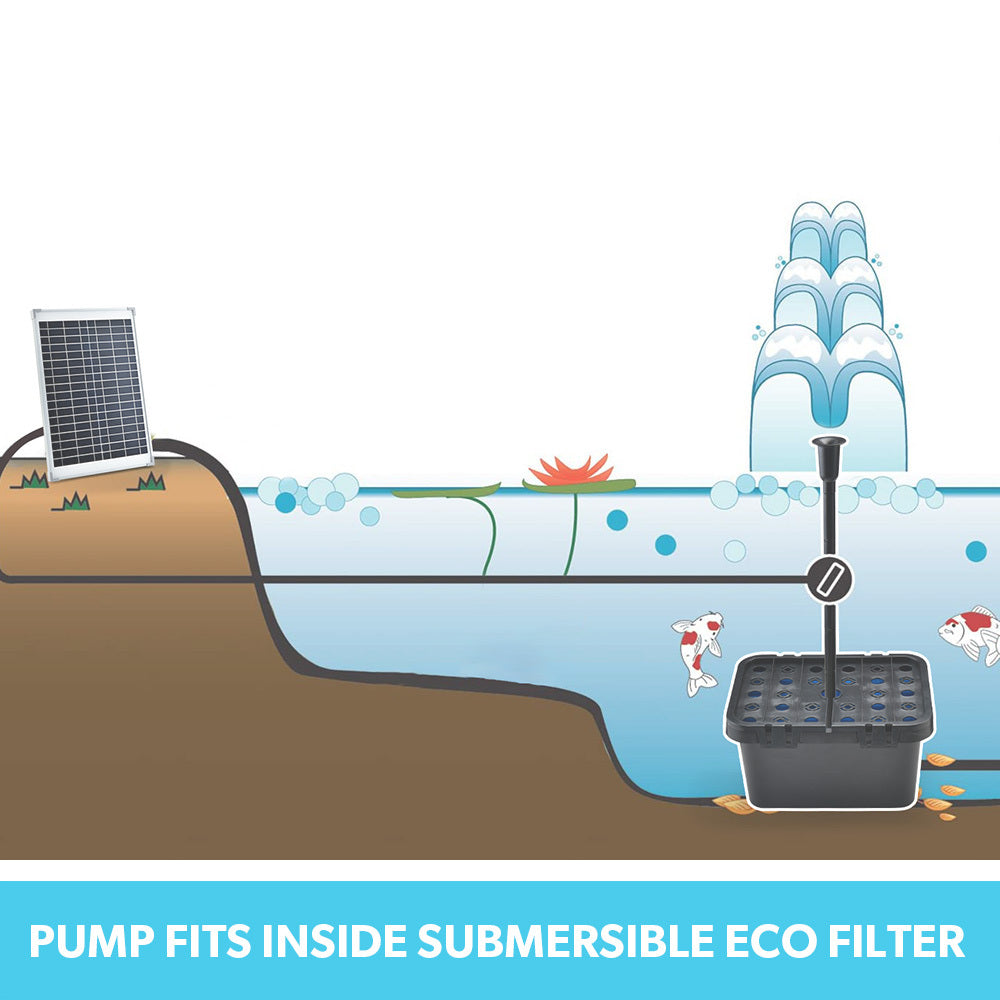 The pump sits securely in the innovative filter box that has a chamber for biochemical balls that together promote the growth of beneficial bacteria, while at the same time cleaning your pond of harmful bacteria such as ammonia and nitrate. The 2 stage filtration system extends the life of your pump by preventing any debris from entering the unit.