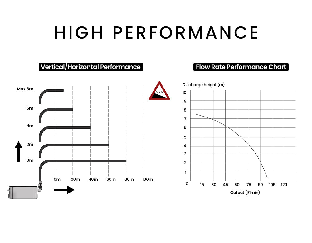 The Shower Plus runs quietly thanks to the smooth 200W copper wound motor and rubber feet. It is capable of pumping up to eight metres vertically and 80 metres horizontally.