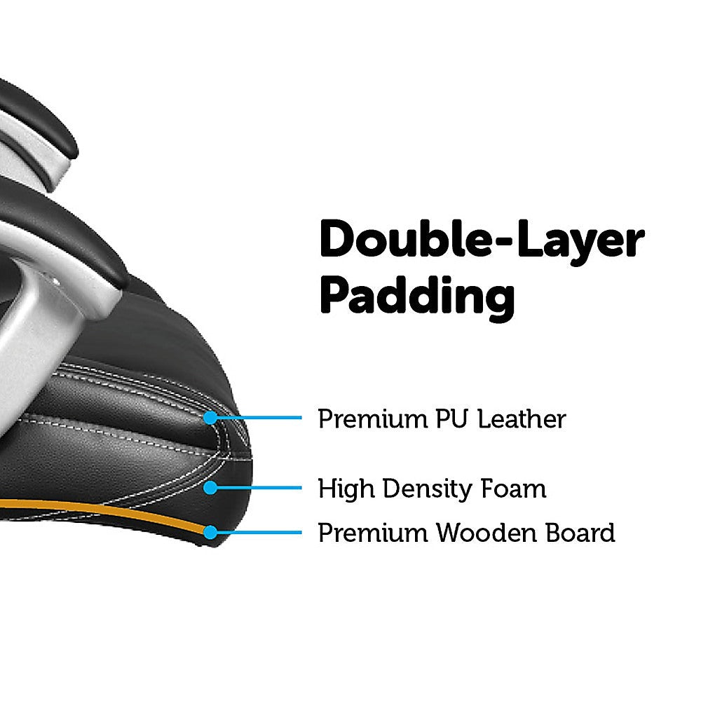 Crafted from premium-grade black PU leather, this chair exudes executive elegance while ensuring durability and easy maintenance. Simply wipe it clean to keep it looking new. The double-layer padding on the seat and armrests, along with a dedicated neck cushion, provides exceptional comfort for all-day use.
