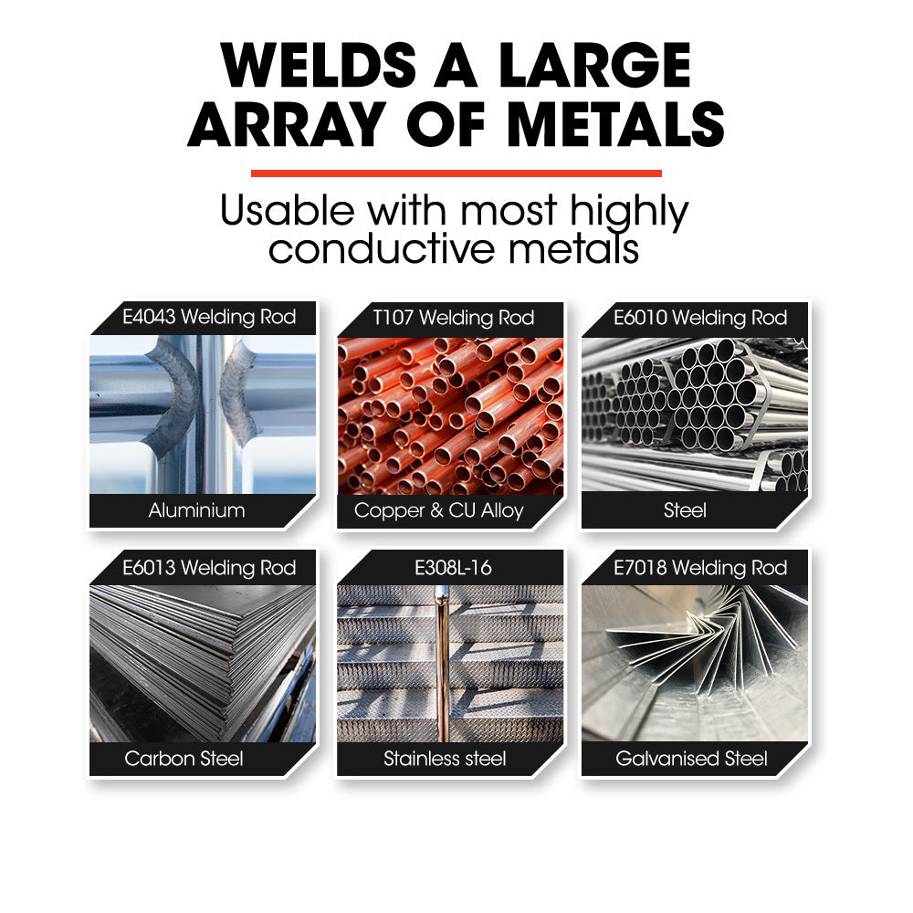 This 160 Amp can handle a variety of electrodes like E4043 for aluminium, E7018 for galvanised steel, and E6013 for carbon steel to meet all your welding needs. It’s perfect for stainless steel, iron, Low-carbon steel, copper, aluminium, and zinc.