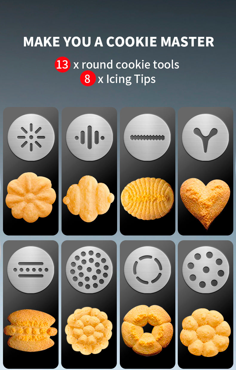 Complete Baking & Decorating Set: Includes 1 durable cookie press gun, 13 interchangeable cookie discs for a variety of fun shapes, and 8 stainless steel icing nozzles for intricate decorating. Create everything from classic spritz cookies to beautifully piped desserts.