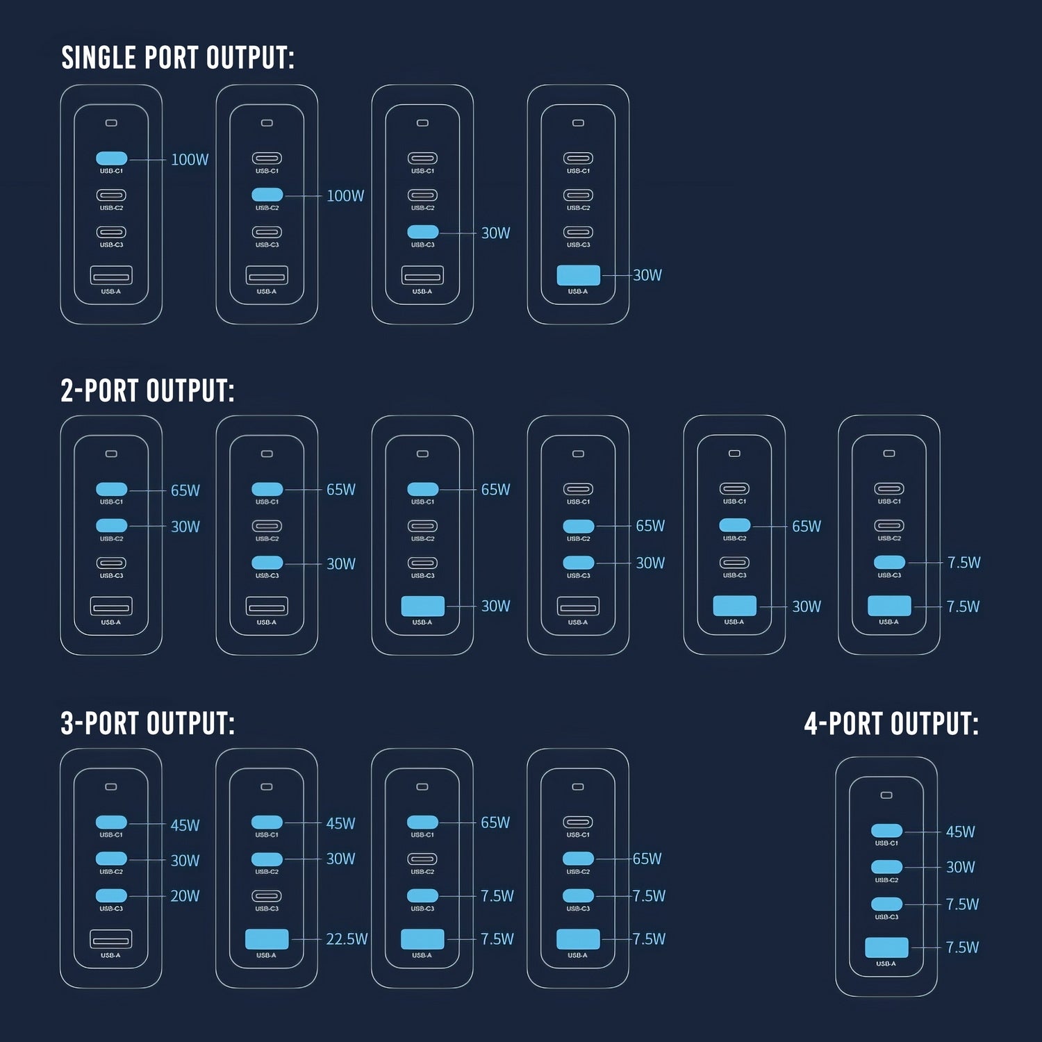 Intelligent power distribution ensures that the USB-C port can output the full power of the charger. It automatically adjusts the power output of each port based on the connected devices. This ensures quick and safe charging for any device plugged.