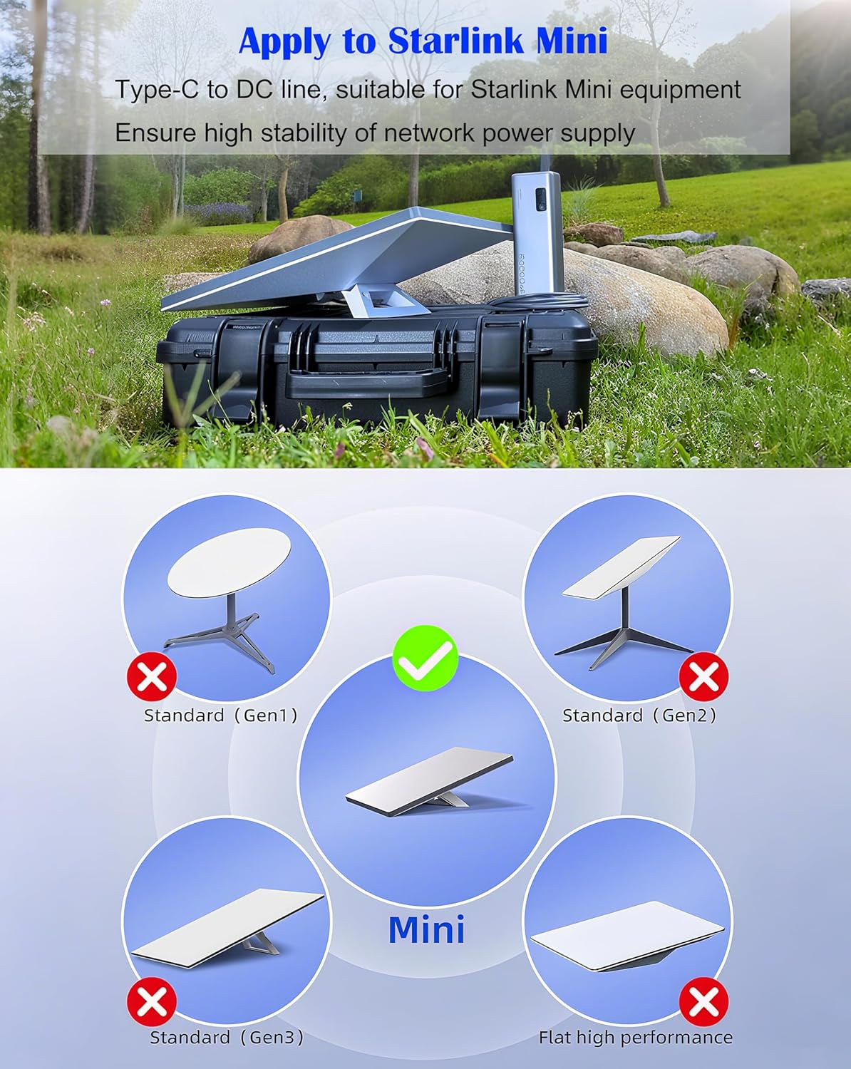 • Designed for Starlink Mini: This USB-C to DC power cable is specially designed to power the Starlink Mini via a USB-C PD power source. Built with original-grade quality and 18AWG premium wiring, it ensures optimal power transmission, minimizes energy loss, and enhances durabilitydelivering stable power to your Starlink Mini dish. No extra adapter box is needed; its simple, plug-and-play, and ideal for road trips and RV use.