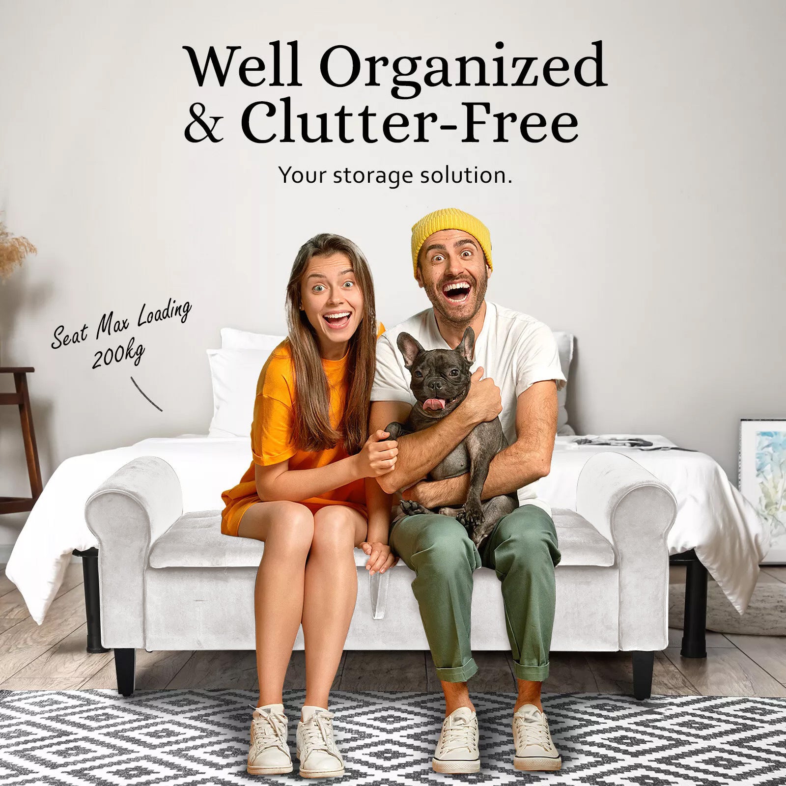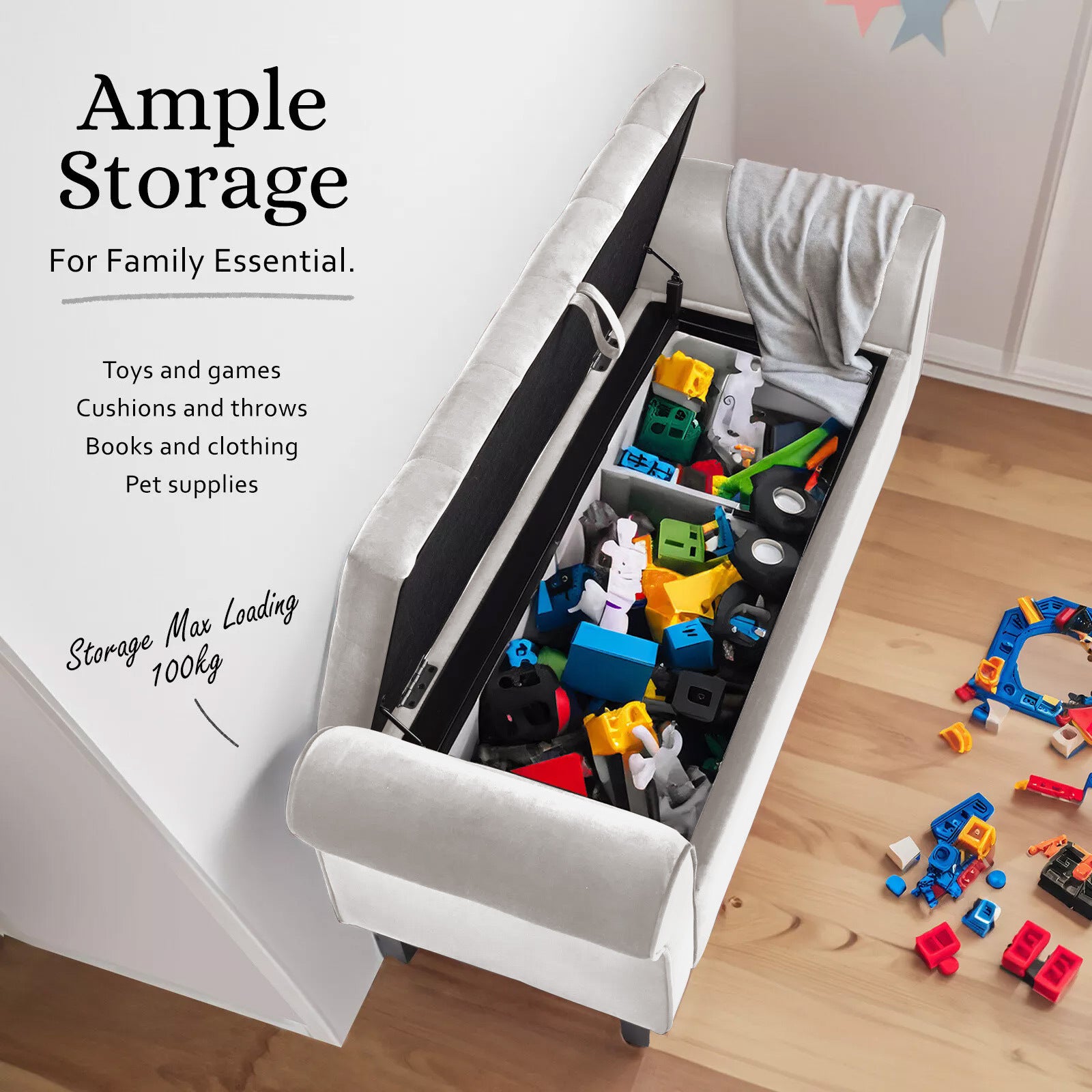 Meet our Velvet Ottoman Storage with Rolled Armrest - a chic and useful addition to your living space. Covered in soft velvet and cushioned with comfy foam, it's a cozy seat with style. Supported by strong wooden legs, this piece is a perfect blend of classic and robust design.
