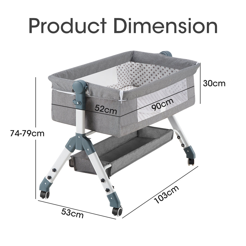 Busy new parents need a reliable baby cot that ensures their baby sleeps comfortably while offering convenience. Our baby cot serves as both a standalone crib, gently rocking to soothe your baby to sleep, and a bedside sleeper for easy nighttime care, allowing you to focus on those precious moments together. Our baby bassinet ensures your baby's health with a detachable canopy featuring mosquito netting to keep mosquitoes out, ensuring uninterrupted sleep. The firm mattress, filled with sponge and PVC hollow board, supports your baby's developing bones and muscles, reducing the risk of suffocation and SIDS. Additionally, our baby bed can be tilted 5 degrees to soothe indigestion and alleviate reflux, ensuring your baby's comfort throughout the night. The breathable mesh sides enhance airflow, promoting your baby's comfort and providing parents with a clear view for peace of mind.