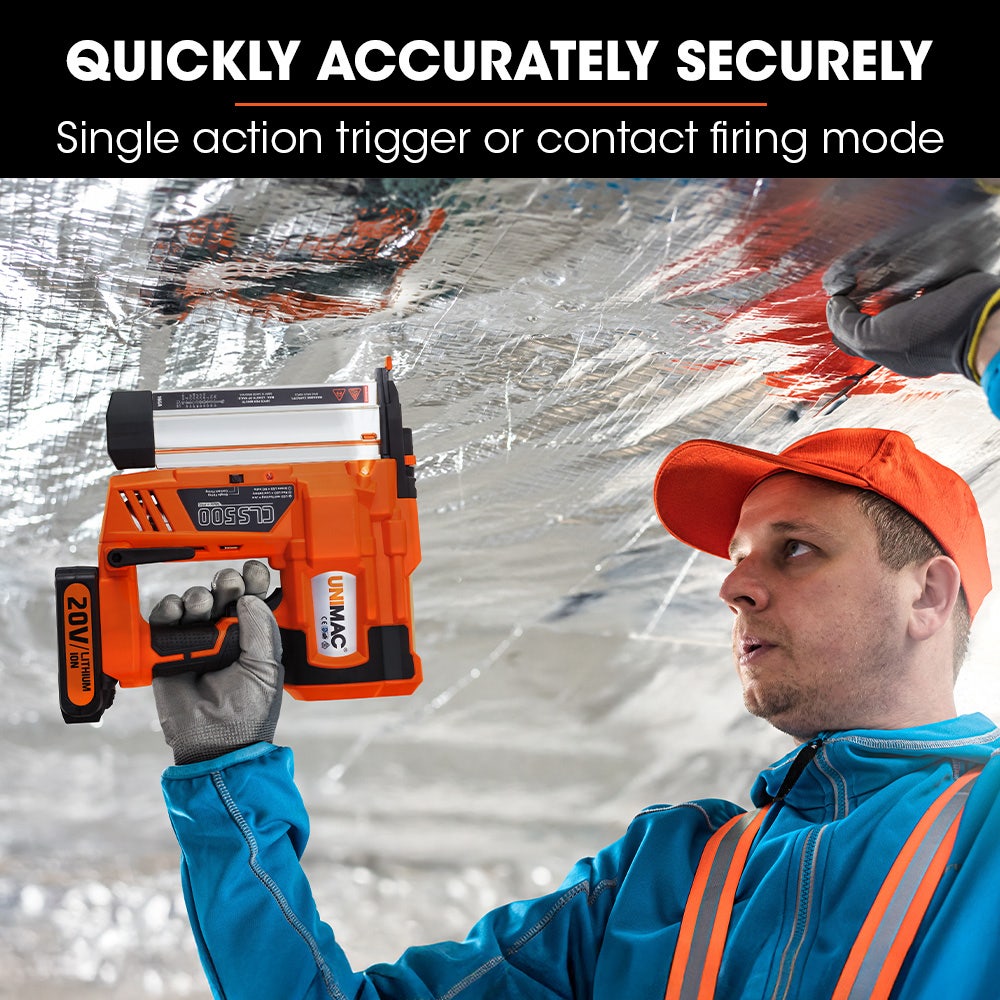 Unimac is proud to present the NEW CLS500 20V Lithium-ion 2-in-1 Brad Nailer and Stapler. This performance driven, innovative cordless tool offers one of the most versatile fastening solutions for interior carpentry professionals and DIYers. Compatible with 18 gauge 15-50 mm brad nails and 10-40 mm staples, the CLS500 is suitable for a wide range of fastening applications, such as attaching small mouldings and trim to fine-grain woodworking projects, fastening furniture, carpet, flooring, electrical and construction applications, and much more. This heavy-duty unit operates on a powerful 20V li-ion battery, allowing you to work without the burden of cords or hoses. Its output is firm and concentrated for easy penetration into solid woods, but gentle enough to suit delicate installations without splitting wood. Its quick release stainless steel magazine has a large 100 fastener capacity, catering to an output of 60 nails/staples every minute.