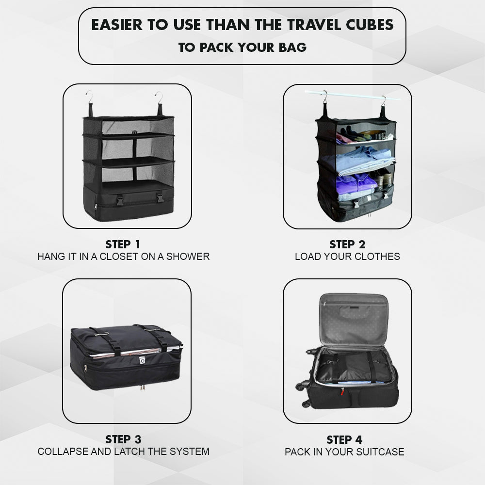 Crafted from premium Canvas fabric, our Portable Travel Storage Bag boasts high-quality, water-resistant, and tear-resistant features for enduring durability. With three mesh layer pockets, one zipper pocket, and three storage shelves, it provides versatile options for organizing clothes, shoes, toiletries, and more. Featuring a space-saving design with two hanging hooks, it can be conveniently hung on the wall or a pole. This wardrobe storage rack is not only spacious but also portable and foldable, making it ideal for on-the-go use, perfect for travelers, campers, and outdoor enthusiasts who seek convenient access to essentials during their adventures.