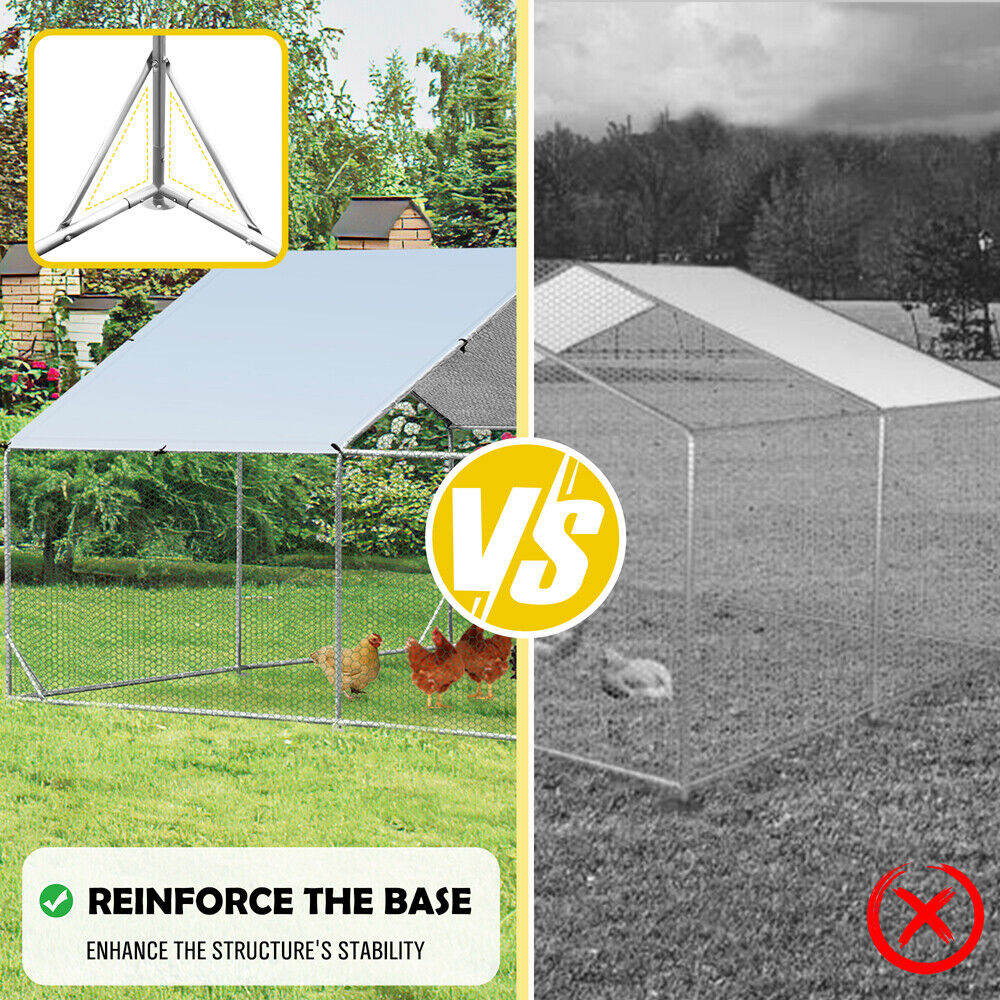 Still finding a large cage for your chickens? Our walk-in pen run is your perfect choice!This chicken coop is designed with lockable door and close hexagonal mesh, both of which prevent your pets from escaping and protect them from predators. Moreover, you dont really need to worry about what if bad weather comes because the sturdy galvanized metal frame with ground stakes ensure reliable stability to well withstand rigorous conditions. The waterproof and sun-protective oxford cover also helps create a cozy living environment for poultry. And water, snow and debris can run off the spire-shaped roof easily. All in all, our large poultry cage is a safe and comfortable shelter for chickens, ducks, rabbits, dogs and other animals.