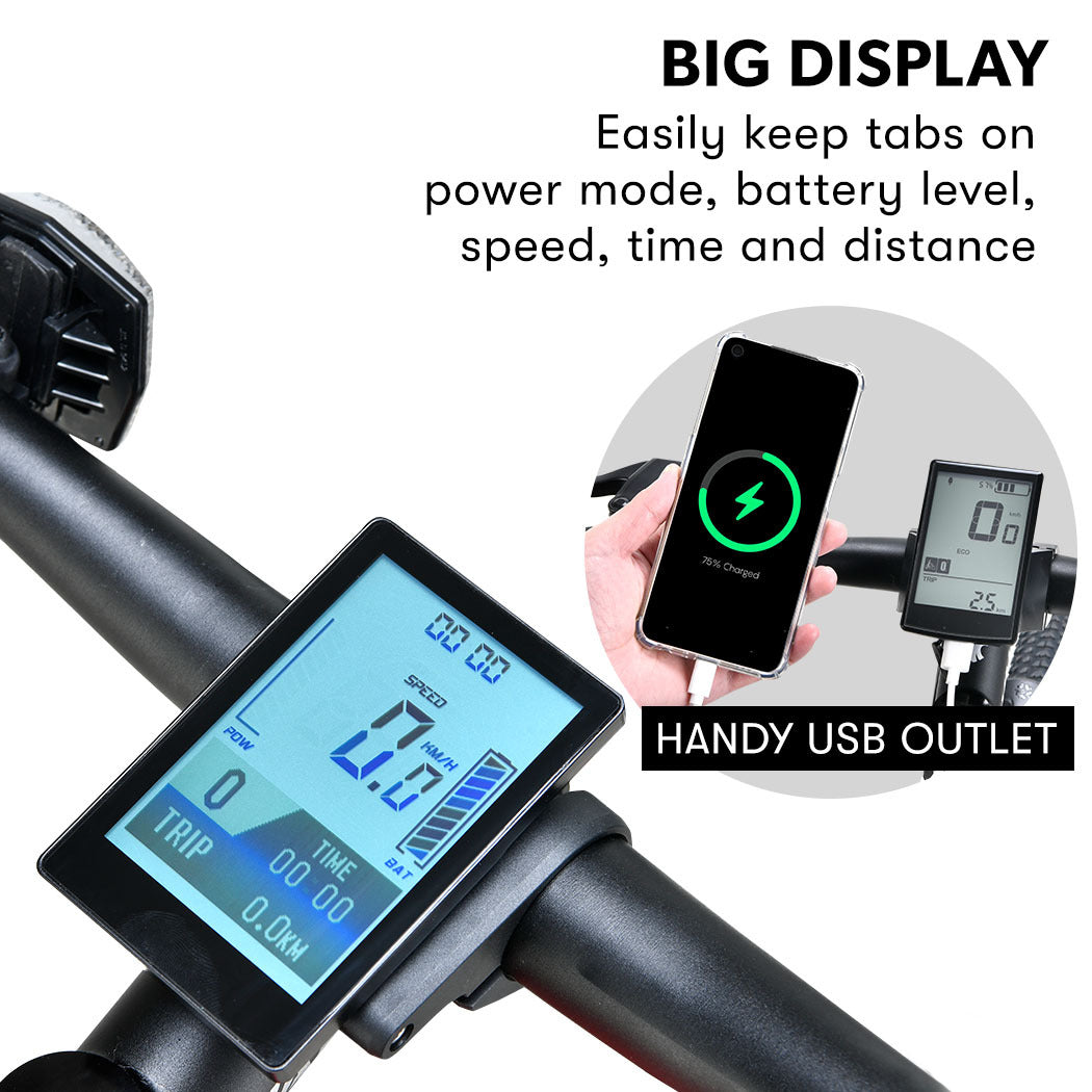 As you ride, the good-sized LCD clearly displays the details you need; Speed, Power Assistance Level, Distance and Battery Charge, and also has a USB outlet for convenient phone charging. The LED headlight is wired to the bikes battery and provides brilliant illumination for night riding. The XDT front forks are adjustable and feature lock out. And, when youre done, the battery is easily removed for a recharge.