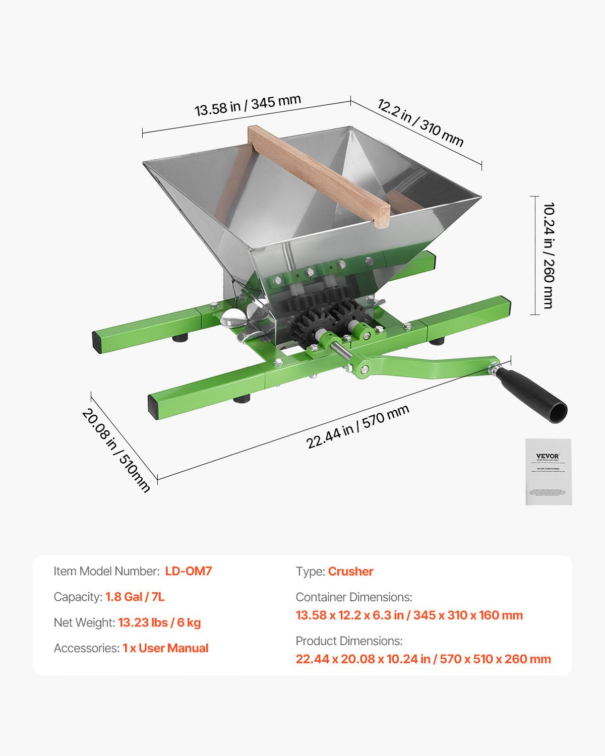 This fruit and apple crusher features a 7L/1.8Gal capacity, designed for powerful performance and fast crushing speed, saving you significant time and effort