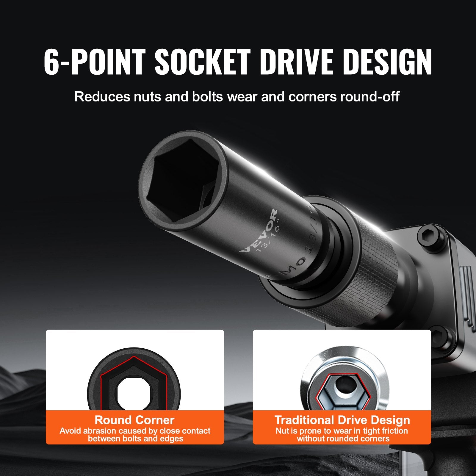 Distinguished by its hexagonal drive design, which sets it apart from traditional designs lacking rounded corners, this socket tool set significantly reduces pressure exerted on fasteners during impact. As a result, it minimizes wear and effectively prevents bolt rounding and stripping.