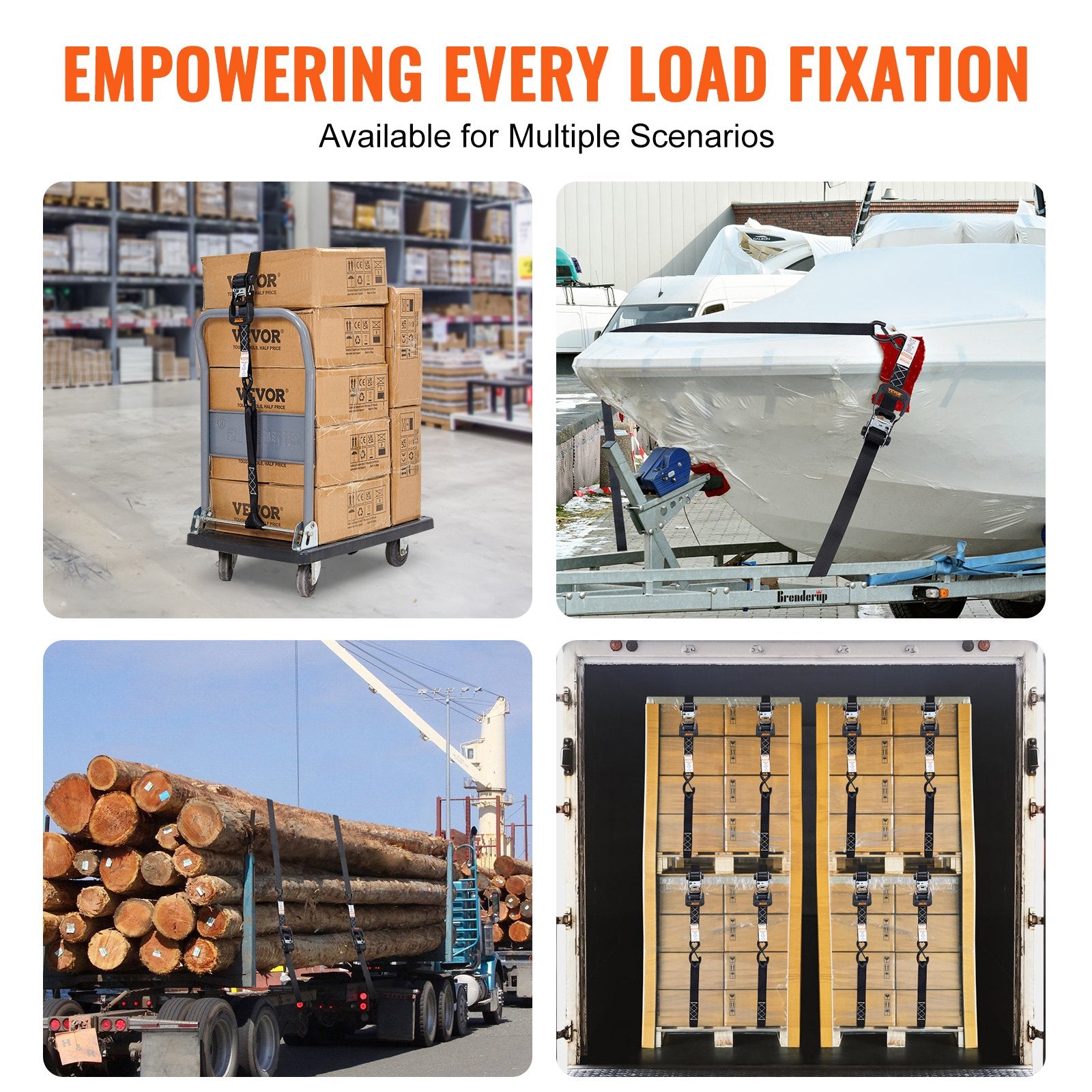VEVOR ratchet straps provide durable and reliable security for transporting various small and large objects, including motorcycles, canoes, kayaks, ATVs, boxes, boats, furniture, lawn equipment, heavy machinery, and other cargo via truck beds, trailers, or roof racks.