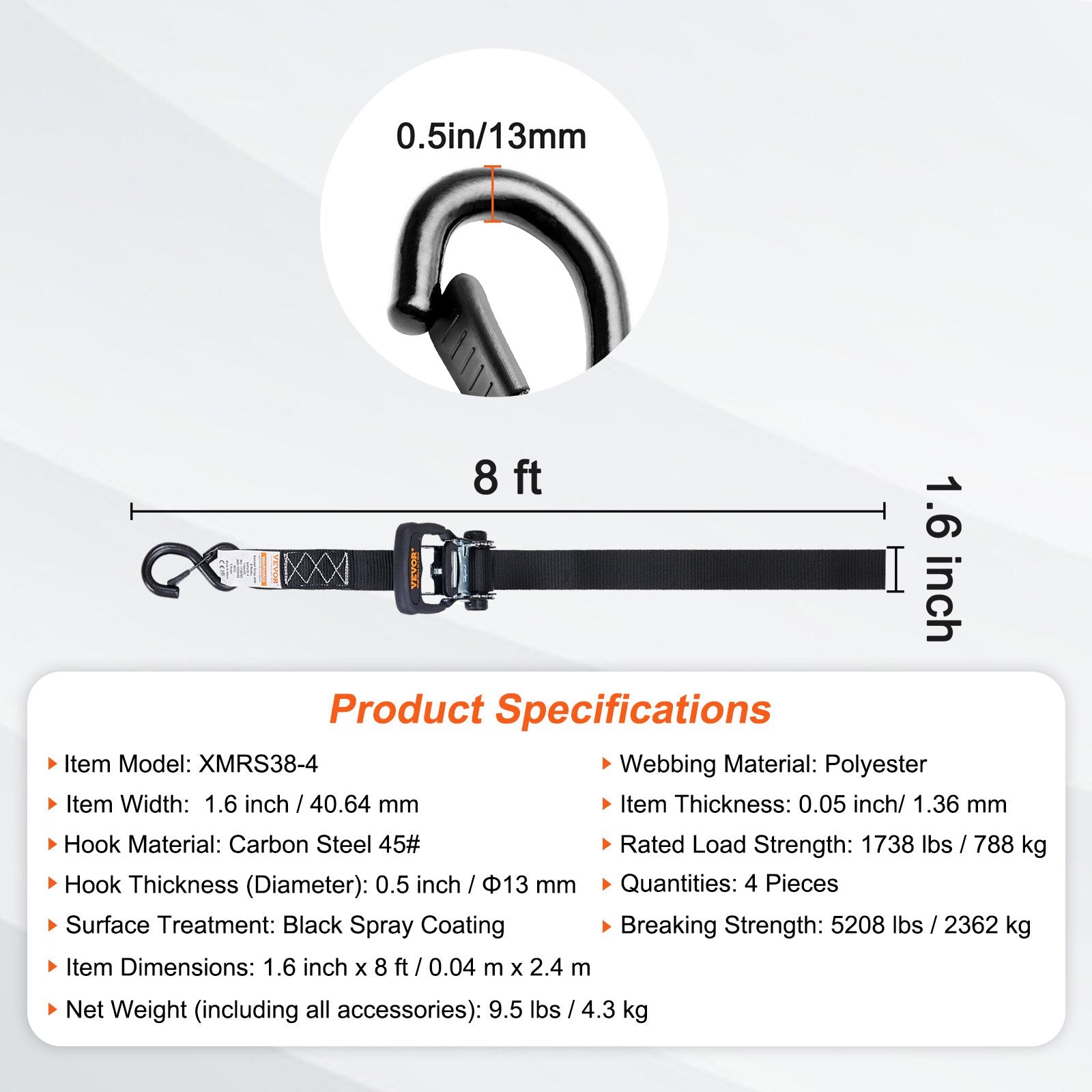 The webbing is made of high-quality material with additional stitching, providing unbeatable performance even when handling heavy loads in strong winds. Each ratchet has an official load capacity of 1738 lbs and a breaking strength of up to 5208 lbs.