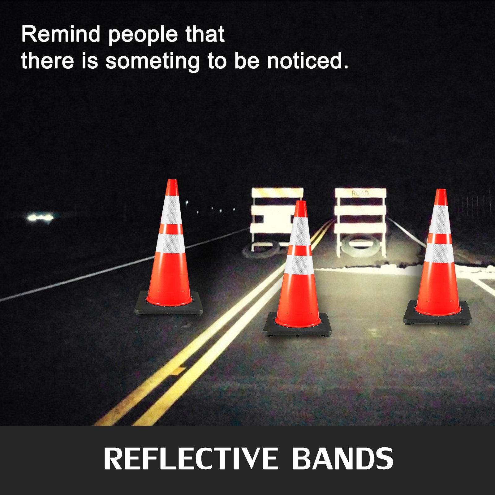 Our fluorescent orange traffic cones feature high visibility, which makes them visible from any angle at distance as far as 800 feet. Moreover, two 6" x 4" silver reflective collars make the traffic cones noticeable, so people can be warned no matter if it's day or night, sunny or rainy.