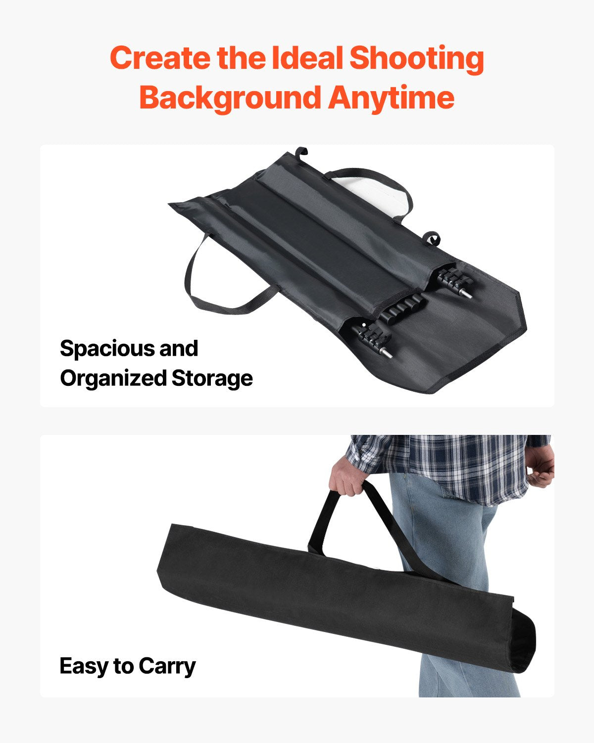 This backdrop holder has spring-loaded pins at each crossbar joint for quick assembly and disassembly, with no tools required. The carrying bag makes it easy to store and transport to set up the ideal backdrop anywhere.