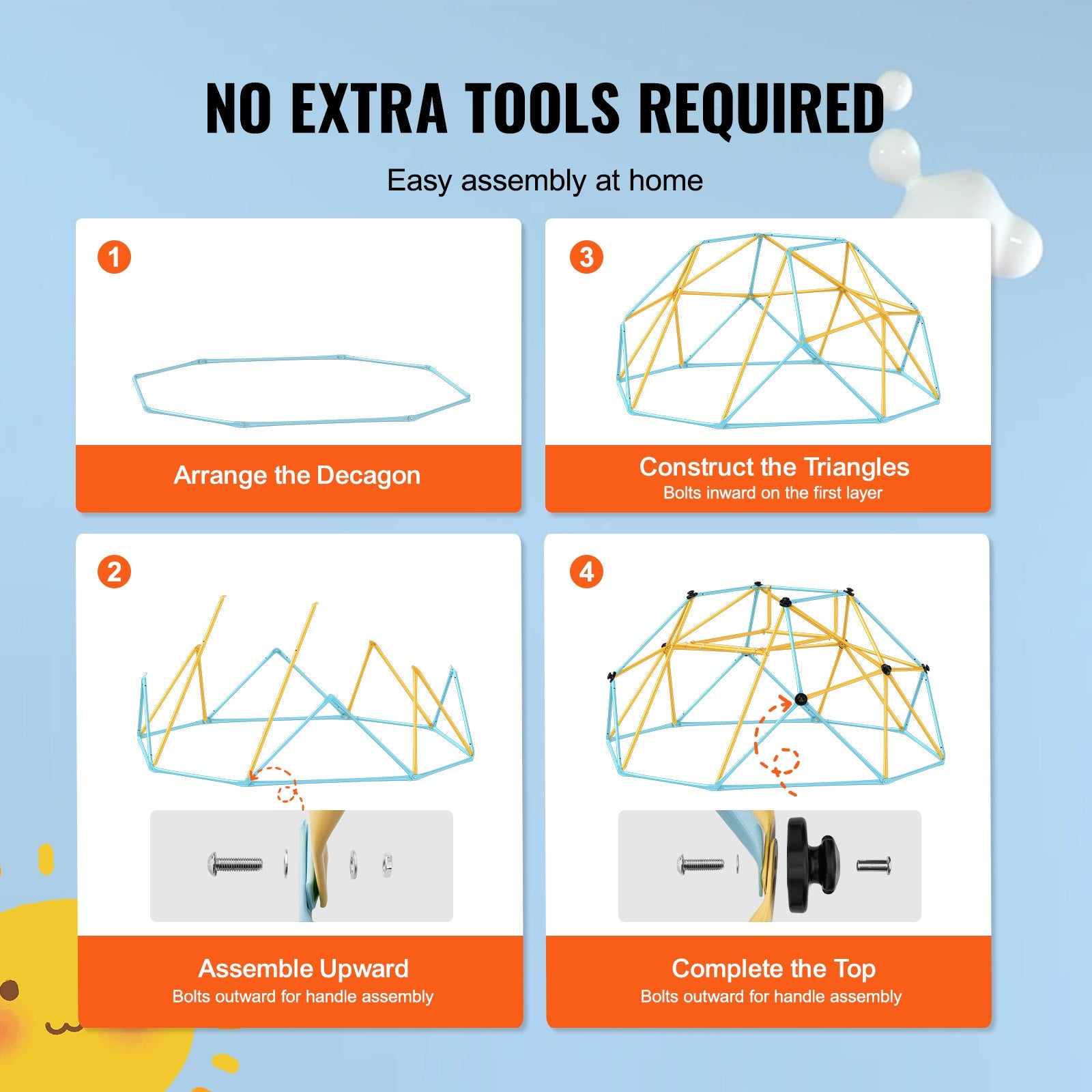 Everything you need is included, from installation tools to detailed manuals and video guides. Our clear instructions will effortlessly guide you through assembly, allowing you to quickly create a fun playground for your children with our kids climbing dome.