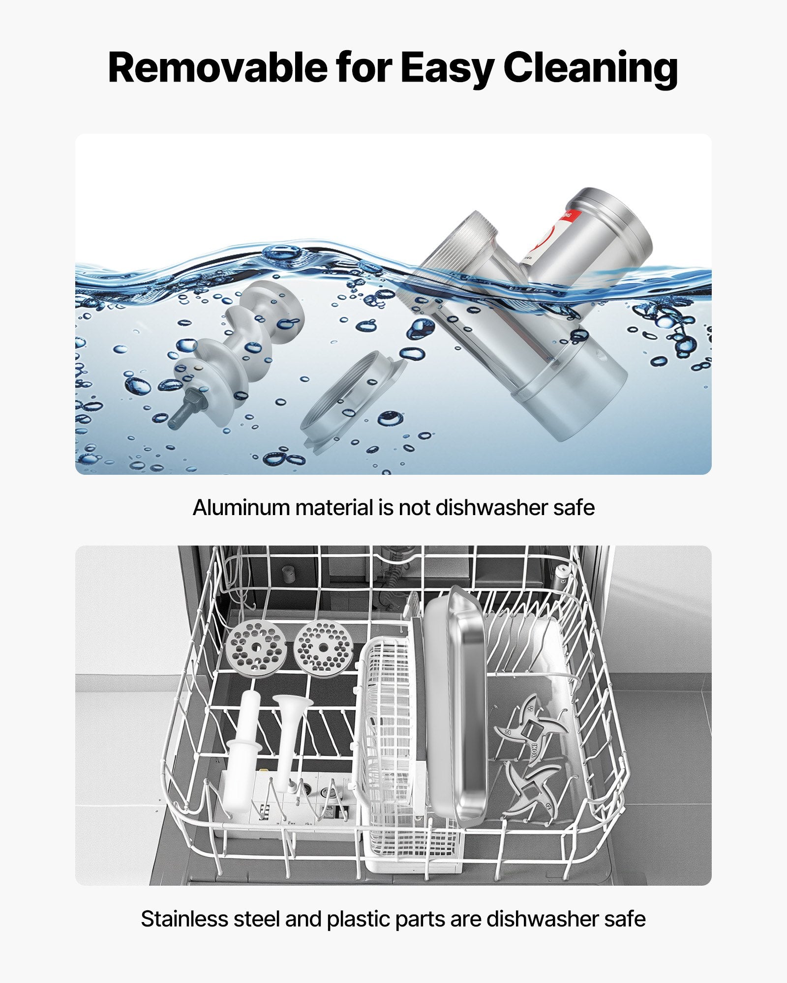 The electric meat grinder is made of carbon steel and stainless steel, with sharp SUS420 blades that are durable and capable of grinding chicken cartilage, frozen meat, and more