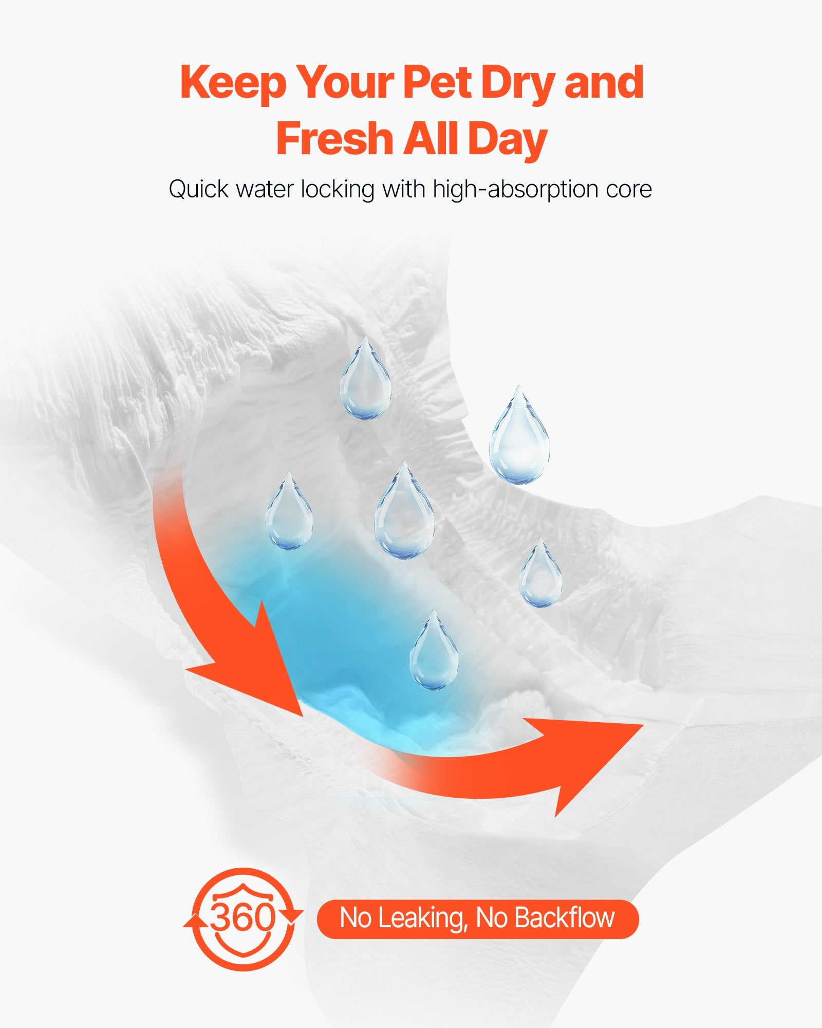 VEVOR M-sized disposable female dog diapers feature a super absorbent core that quickly locks in liquid, offering 360° leak-proof protection with no backflow. Perfect for dogs in heat cycles, pet training, incontinence, post-surgery recovery, and travel. Suitable Waist Size: 15-23 inches / 38.1 - 58.42 cm