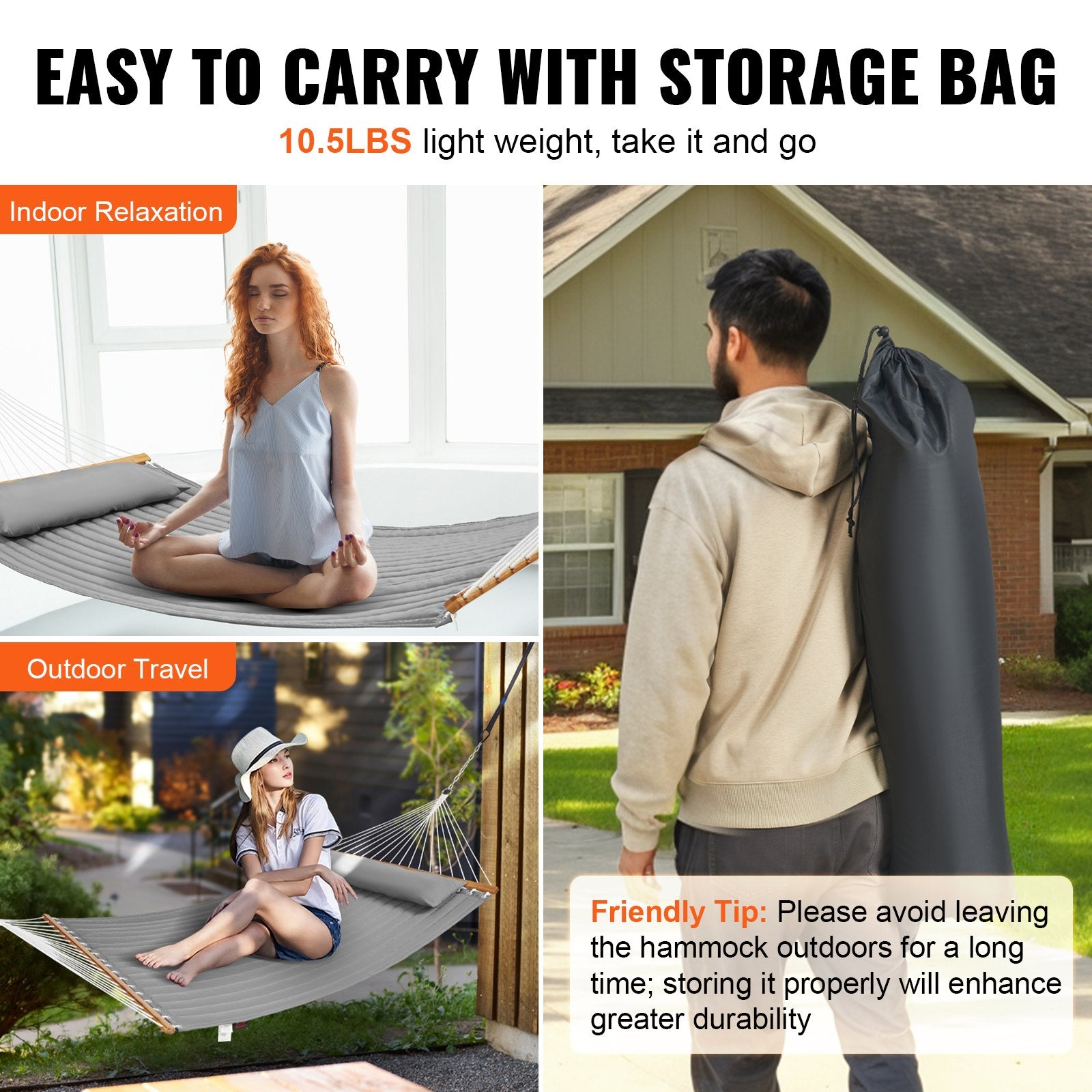Our double quilted hammock with spreader bars offers a variety of colors and styles, making it perfect for your backyard, garden, patio, poolside, and more. Effortlessly set up and pack away, use it with trees or a hammock stand, and turn your place into a delightful retreat.