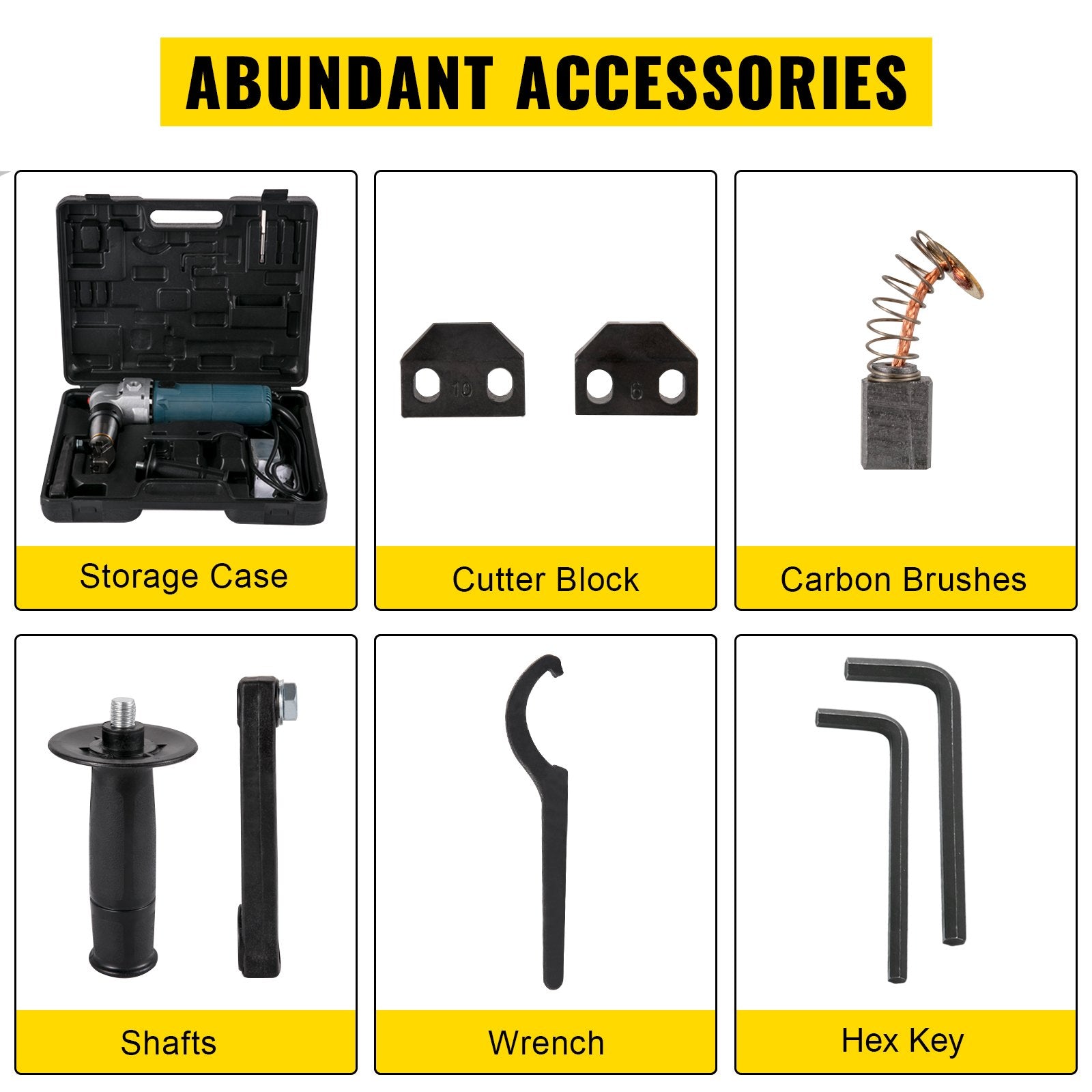 Our nibbler tool is equipped with a pair of replacement tool blocks, a wrench, a set of hook-type tools, two hexagon spanners, and comes with a toolbox for easy carrying.