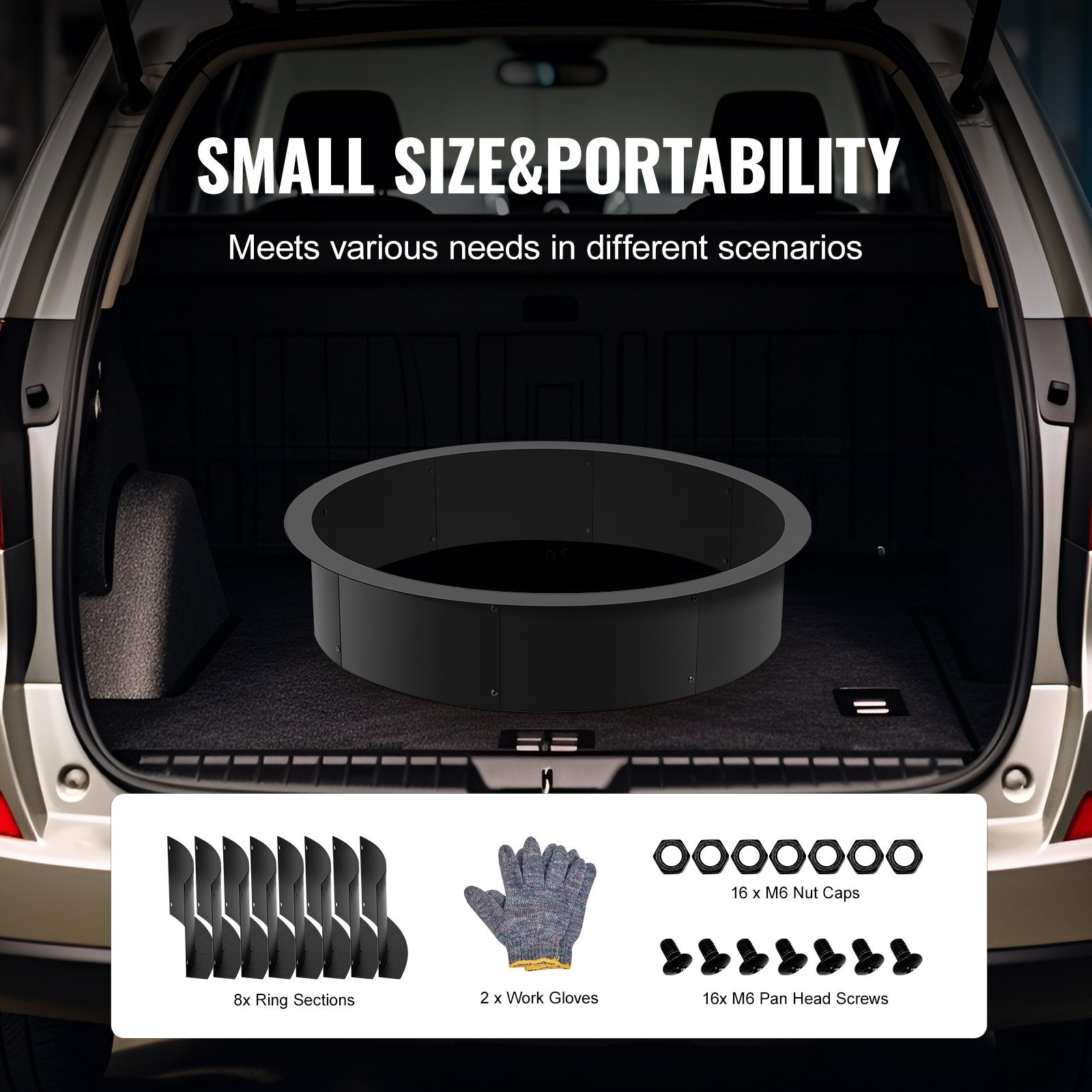 The outer diameter is 40 inches (1016 mm), inner diameter is 36 inches (914.4 mm), height is 8.5 inches (215.9 mm), and thickness is 0.06 inches (1.5 mm), providing ample external space to accommodate more firewood and charcoal, ensuring better airflow to facilitate thorough burning and ignite the campfire.