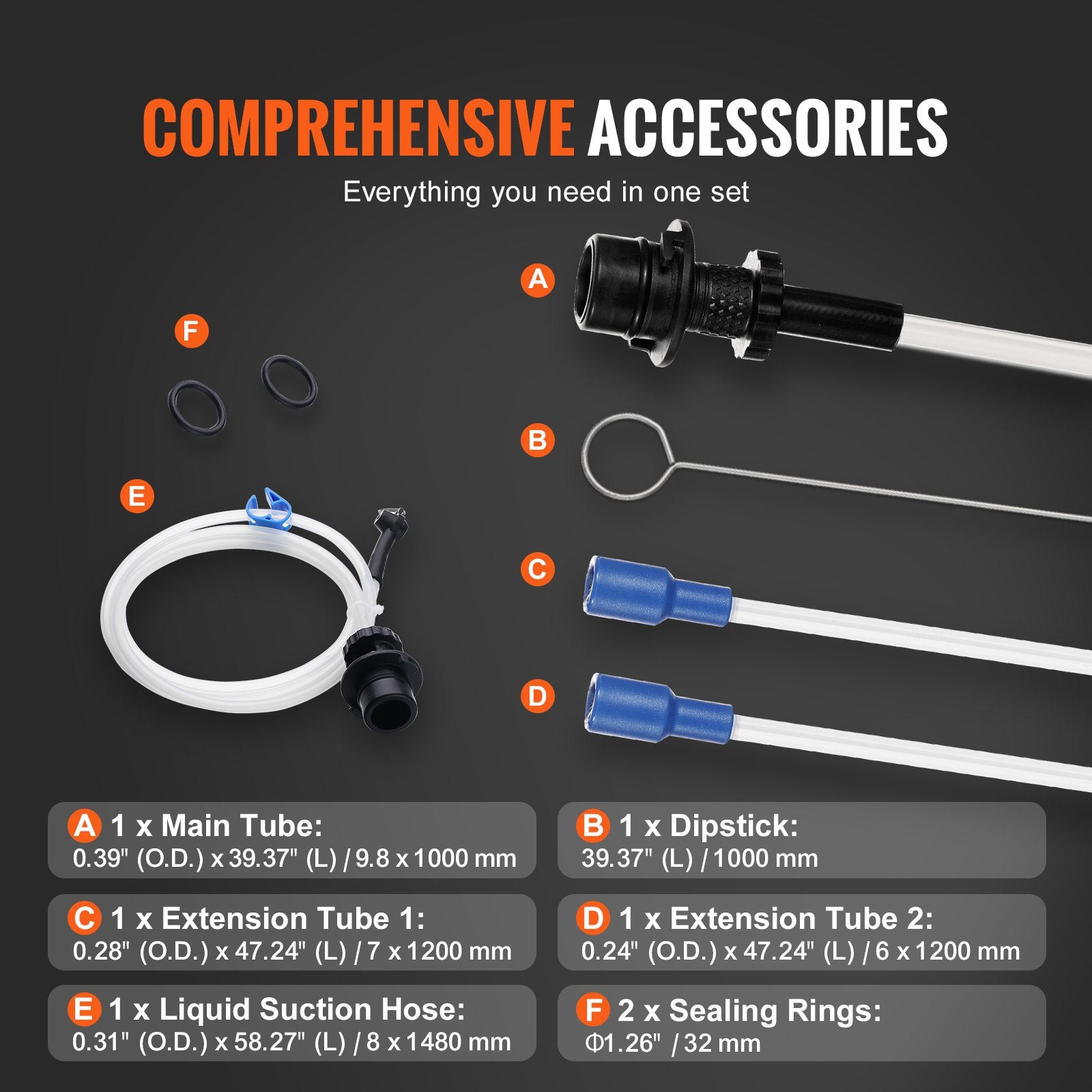 With four sizes of suck-it-all-up oil extractor tubes, you're reaching the deepest depths, leaving tanks dry. Main Tube: 9.8" x 39.37" / 249 x 1000 mm; Extension Tube 1: 0.28" x 47.24" / 7 x 1200 mm; Extension Tube 2: 0.24" x 47.24" / 6 x 1200 mm; Suction Hose: 0.31" x 58.27" / 8 x 1480 mm.