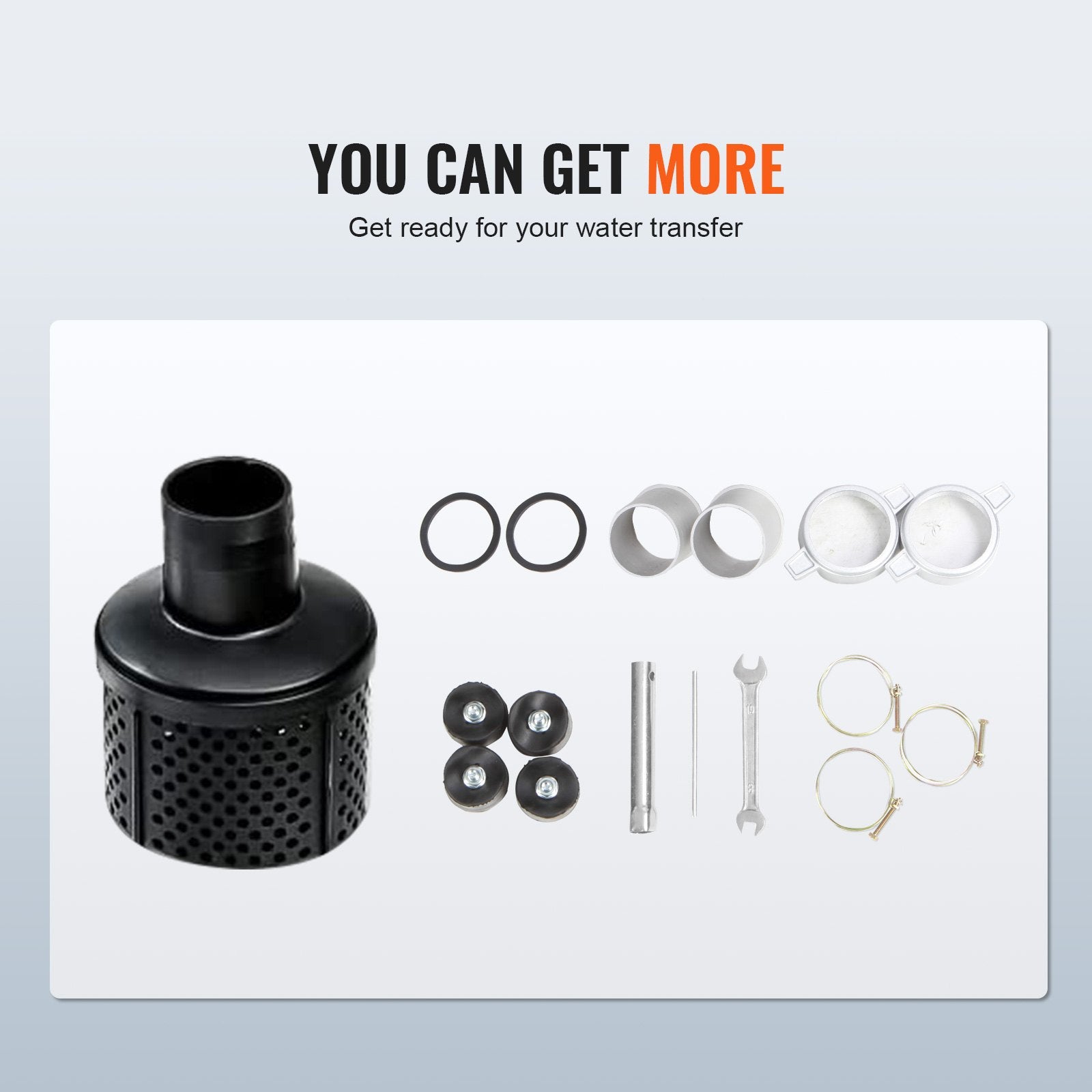 This gas engine water transfer pump comes with everything you need to get started - including a inlet filter screen, spark plug sleeve, forcing rod, wrench pressure cap, pipe joints, sealing rings, shock pads, etc. You'll be up and running in no time!