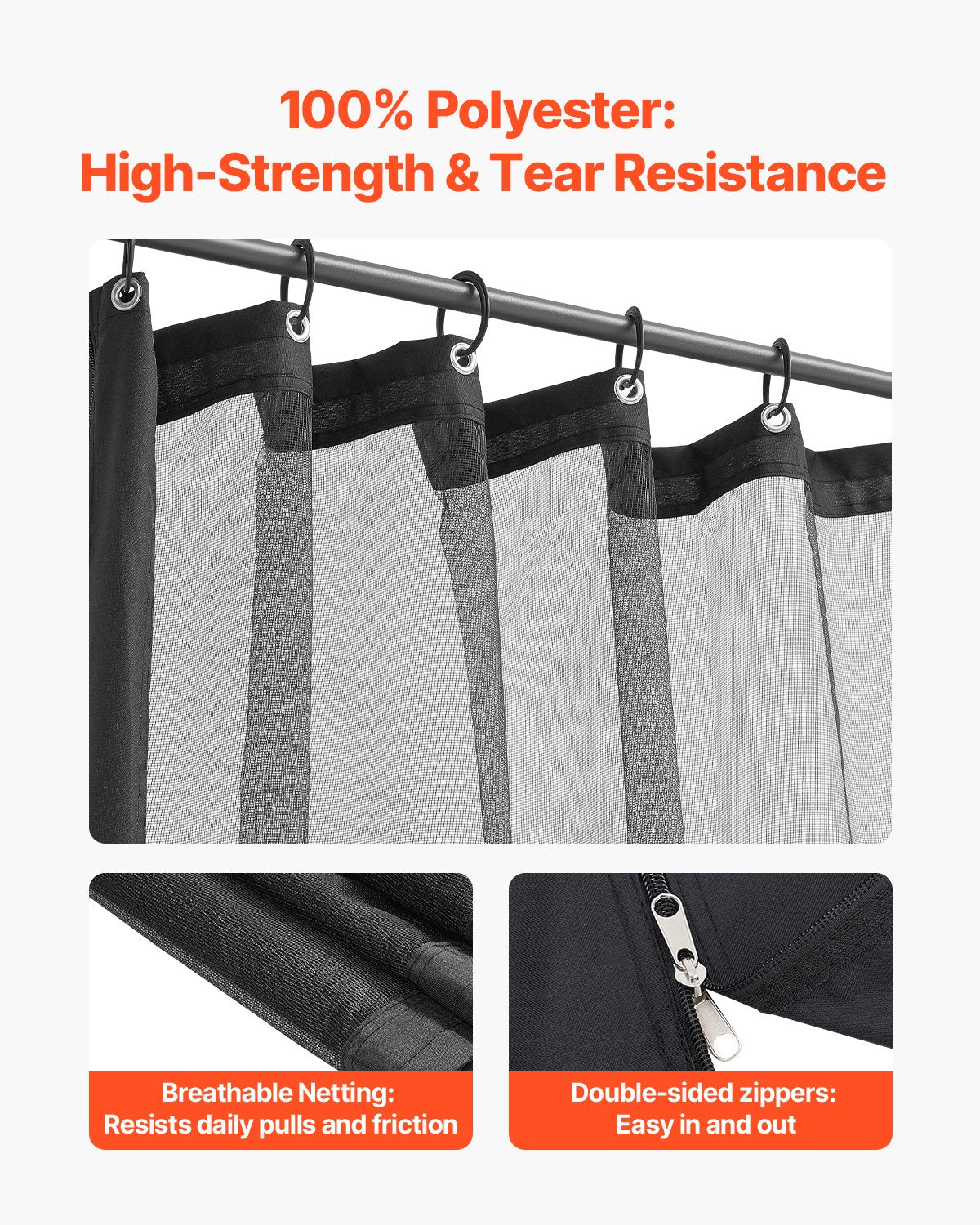 Each side features double-sided zippers for easy access. The mesh patio netting's edges are equipped with fastening straps at the top, middle, and bottom, with aluminum grommets for easy hanging and tear resistance. We provide both plastic hooks and hanging rings as mounting options, allowing you to choose the best method to secure the net to your gazebo.