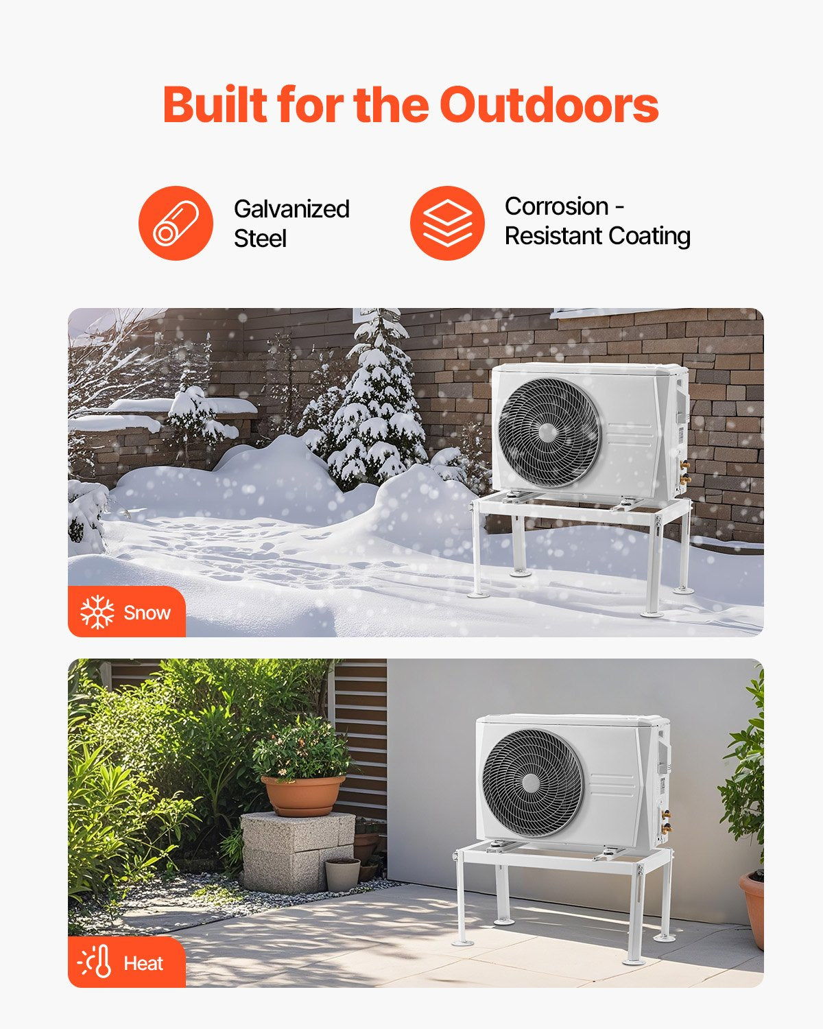 The mini split ground stand is made from galvanized steel with a powder-coated finish, offering exceptional durability and corrosion-resistance to safeguard your AC from harsh weather conditions