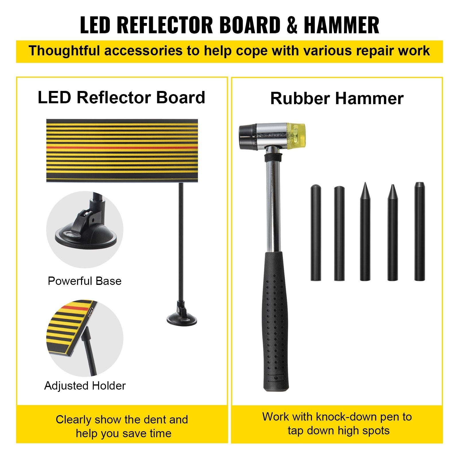 Rubber hammer is used to fix the small and irregular dent damage; it can quickly repair auto-body dents. The yellow hammerhead is soft and translucent. Hammer has a high-quality steel handle with an ergonomic design, comfortable, suitable for prolonged use. The LED reflector board can help you quickly and accurately locate the dent. It shows dents clearly and save your time.