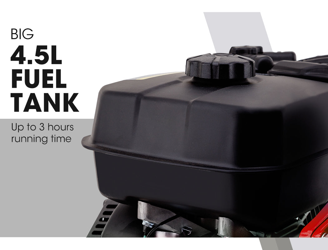 This commercial series features 80mm inlet/outlets, flowing an impressive 40000 Litres/hour (666L/min) with a total head of 60m; coupled with a powerful 235cc 4-stroke engine, transferring water up slope or to a second, third or fourth story now takes less setup time and half the fuss. A convenient sized 4.5L fuel tank means it can run for 3 hours on a single fill (load dependent).