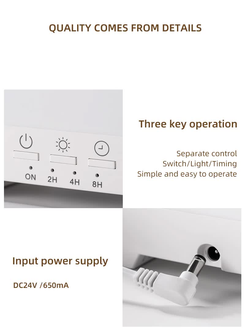 4. Press the power button to turn it on and select your desired mist and light settings (2H, 4H, 8H timers available).