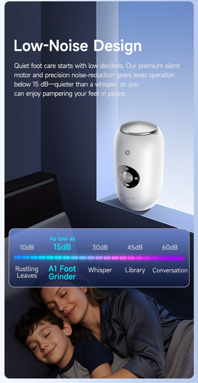 Restore your feet's natural softness with the A1 Smart Electric Foot Callus Remover. Engineered for efficiency and precision, this high-speed pedicure tool effortlessly removes dry, dead skin and stubborn calluses. With its intelligent 3-speed adjustment and dual 360°Rotating premium stainless steel grinding heads, you can customize your foot care routine to suit your skin's needs. Whether you're preparing for sandal season or maintaining everyday foot health, the A1 provides a safe, hygienic, and professional-grade solution in seconds.