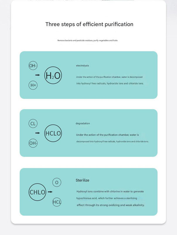 • Three-Step Efficient Purification: Electrolysis (decomposes water into hydroxyl radicals and chlorine ions), Degradation (breaks down residues), and Sterilization (hydroxyl radicals and chlorine combine to form hypochlorous acid for sterilization).